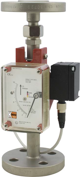 The fluid flows from bottom to top through the meter tube of the flow meter. The float is lifted until an annular gap between the measuring cone and the float is produced which corresponds to the flow. The forces acting on the float are in equilibrium.The height of the float resulting from the flow rate is transmitted by the permanent magnet in the float through the magnetic tracking system in a rotation to the pointer axis of the analog indicator unit.The variable-area flow meter consists of a stainless steel device with an integrated conical stainless steel measuring-tube and a vertically movable float.