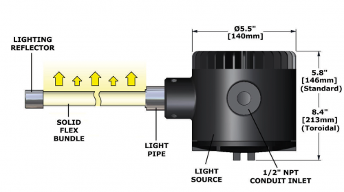 Canty Gauge Glass Lighting Systems are designed to illuminate liquid level gauges and tubular sight flows. The solid flex bundle can easily be attached directly to the tube glass, providing a high intensity light to pass through the liquid, strongly emphasizing the liquid level. Units are designed for use in harsh environments.