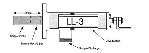 Automatic Sampler for liquids and slurries from pressurized conveying lines. The QCEC Model LL-3 Liquid Flow Automatic Sampler uses a 440 C stainless steel reciprocating probe with 15 cc sample capacity to receive a sample. Each sample cycle begins with the control actuating a 4 way solenoid valve. The solenoid valve activates twin air cylinders extending the probe into the process line. The probe is retracted and the sample is discharged into the composite container.