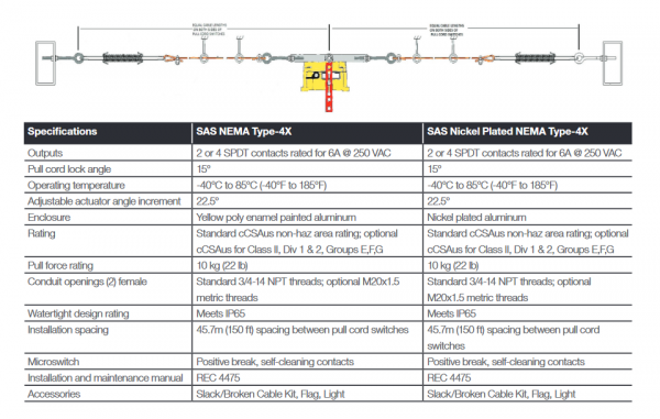 Thermo Scientific™ Ramsey™ Snap Action Switch (S.A.S.) was specifically designed to function as Slack/Broken Cable type Pull Cord but without the false trips associated with the effects of weather conditions such as temperature variations affecting the cables, ice, snow, wind and vibration. The Thermo Ramsey model SAS Snap Action Safety pull cord is a two-sided cable pull emergency stop switch. In addition, it is designed to ensure that should the cable become slack or is accidentally cut, the switch will activate so as to be repaired to normal functionality.